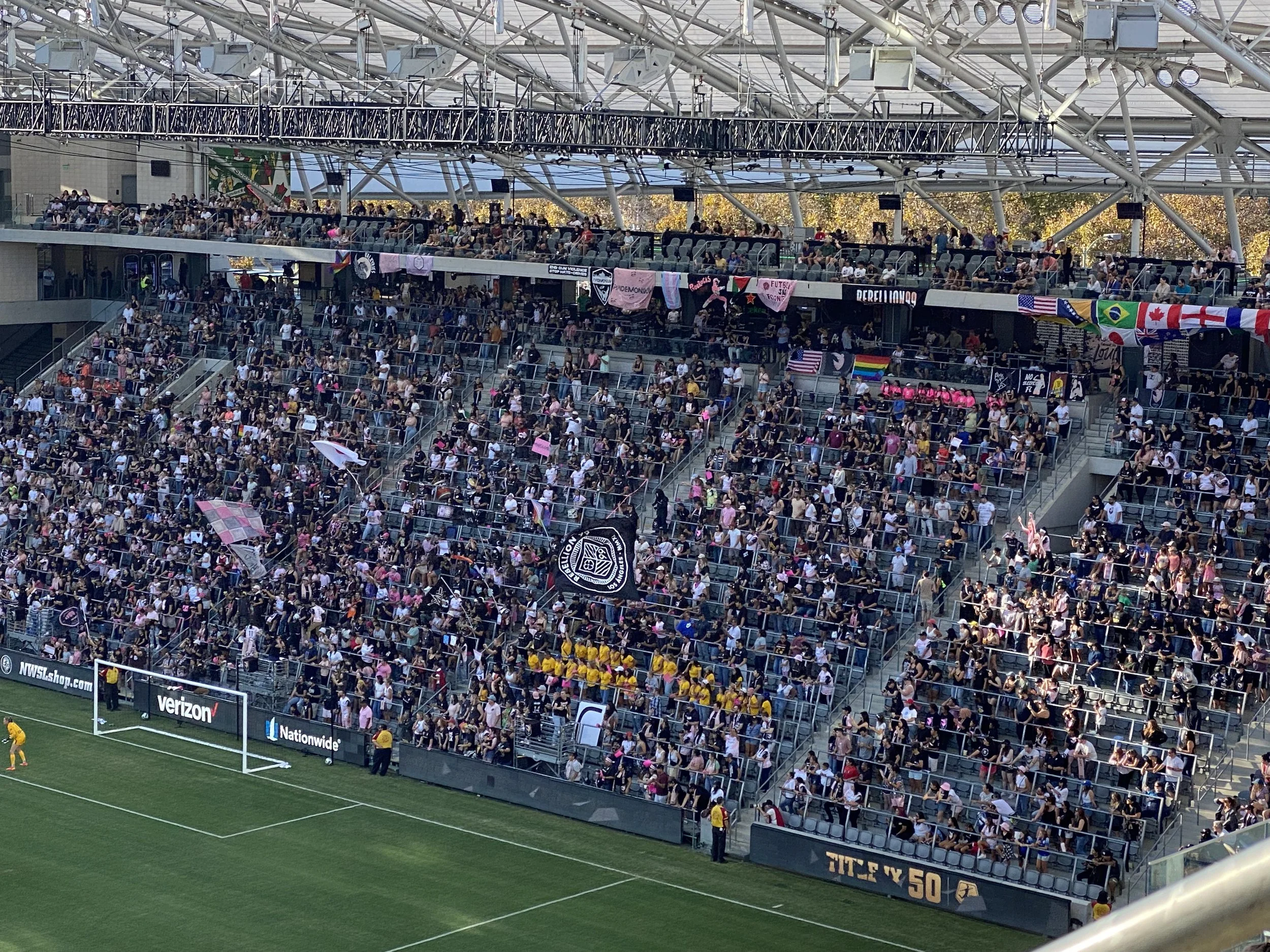 The famous faces of people who are financially invested in the team like, soccer legend Abby Wambach or actress Gabrielle Union, would appear on the big screens from their seats in the owner’s box. There were young teens grouped together watching from the balconies that open up into the second tier of seats, and a wonderful group of older women with their faces painted with the pink and white team colors.